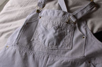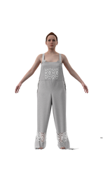 Canvas overalls detailed with lace panels and appliqué, patch pockets, and gold hardware over a scallop-trimmed tube top.